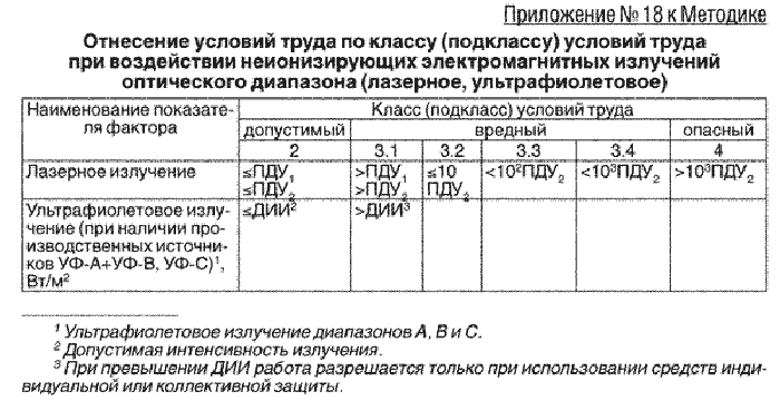 Если посмотреть на строку таблицы по лазерному излучению, то можно понять, что при результатах измерений, находящихся в диапазоне от ˃ПДУ2 до 10 ПДУ2, условия труда оцениваются и классом (подклассом) 3.1 и классом (подклассом) 3.2. А это согласитесь большая разница в компенсациях, предоставляемых работникам за вредные и (или) опасные условия труда. Кроме того, в сноске к таблице нет пояснений, что такое ПДУ1 и ПДУ2. Для справки: ПДУ1 – предельно допустимый уровень при хроническом облучении, ПДУ2 – при кратковременном облучении и, следовательно, они различаются в 5-10 раз (эксперт должен в этом хорошо разбираться).